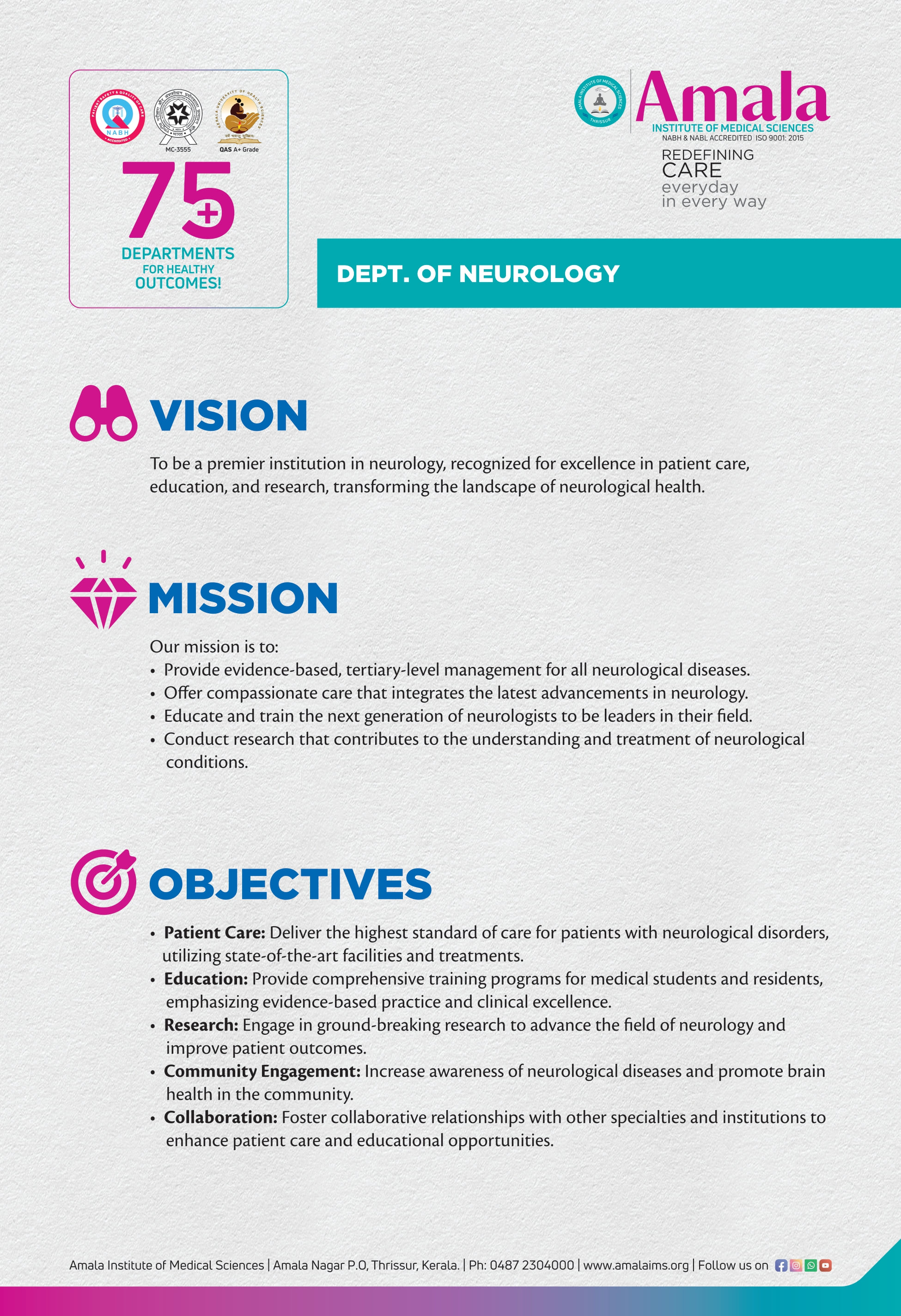 Neurology department of Amala Institute of Medical Sciences started in 1997 and now it provides evidence-based tertiary level management facilities for all neurological diseases.  In 2021, the department started offering D.N.B. superspeciality Course in Neurology, with an intake capability  of two residents.