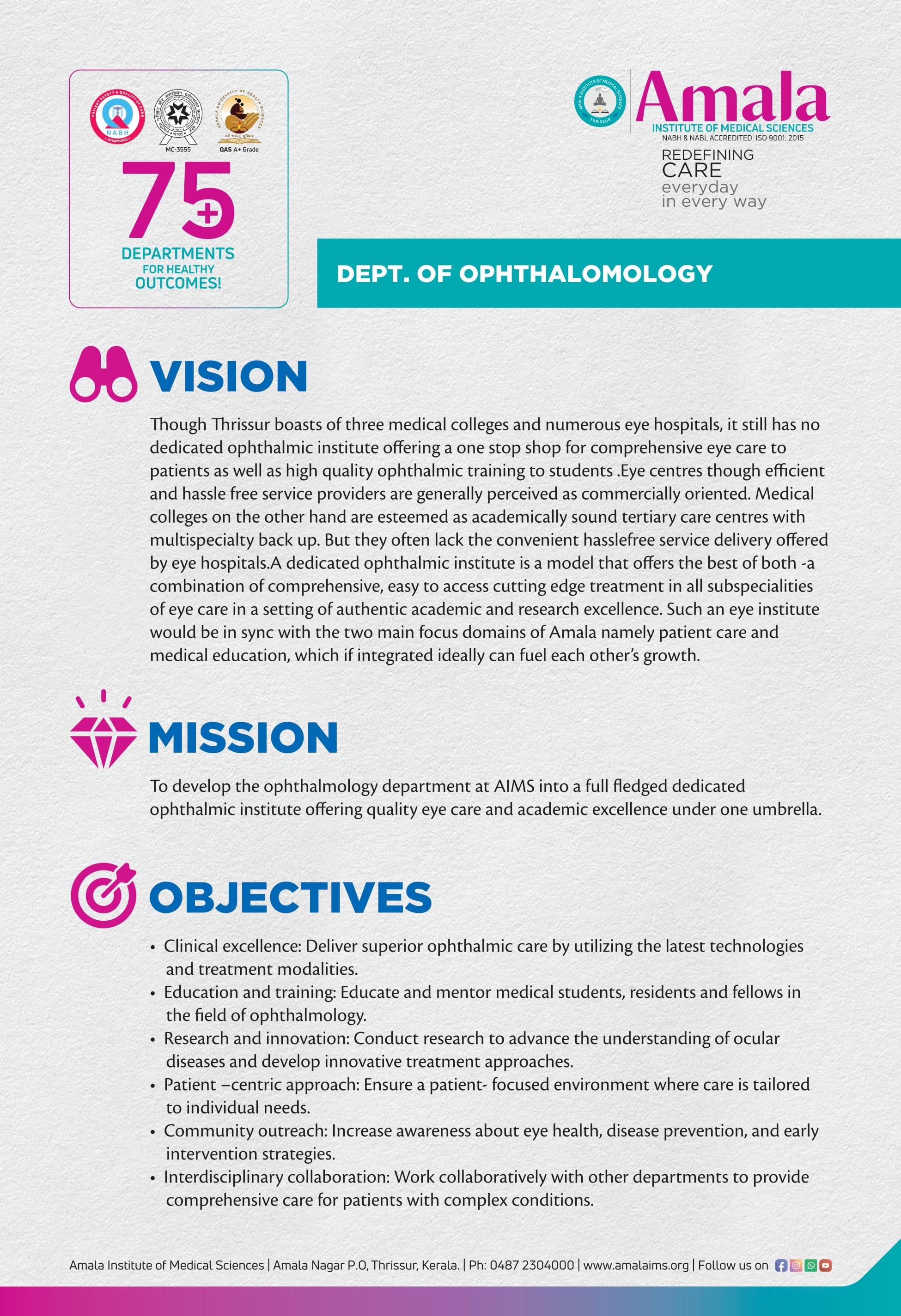 The department of Ophthalmology at AMALA IMS contains a team of impressive Ophthalmologists who are experts in examining, diagnosing and providing the most suitable treatment of all ocular diseases. The department has kept abreast with the latest technological developments and is capable of treating all types of retinal diseases.