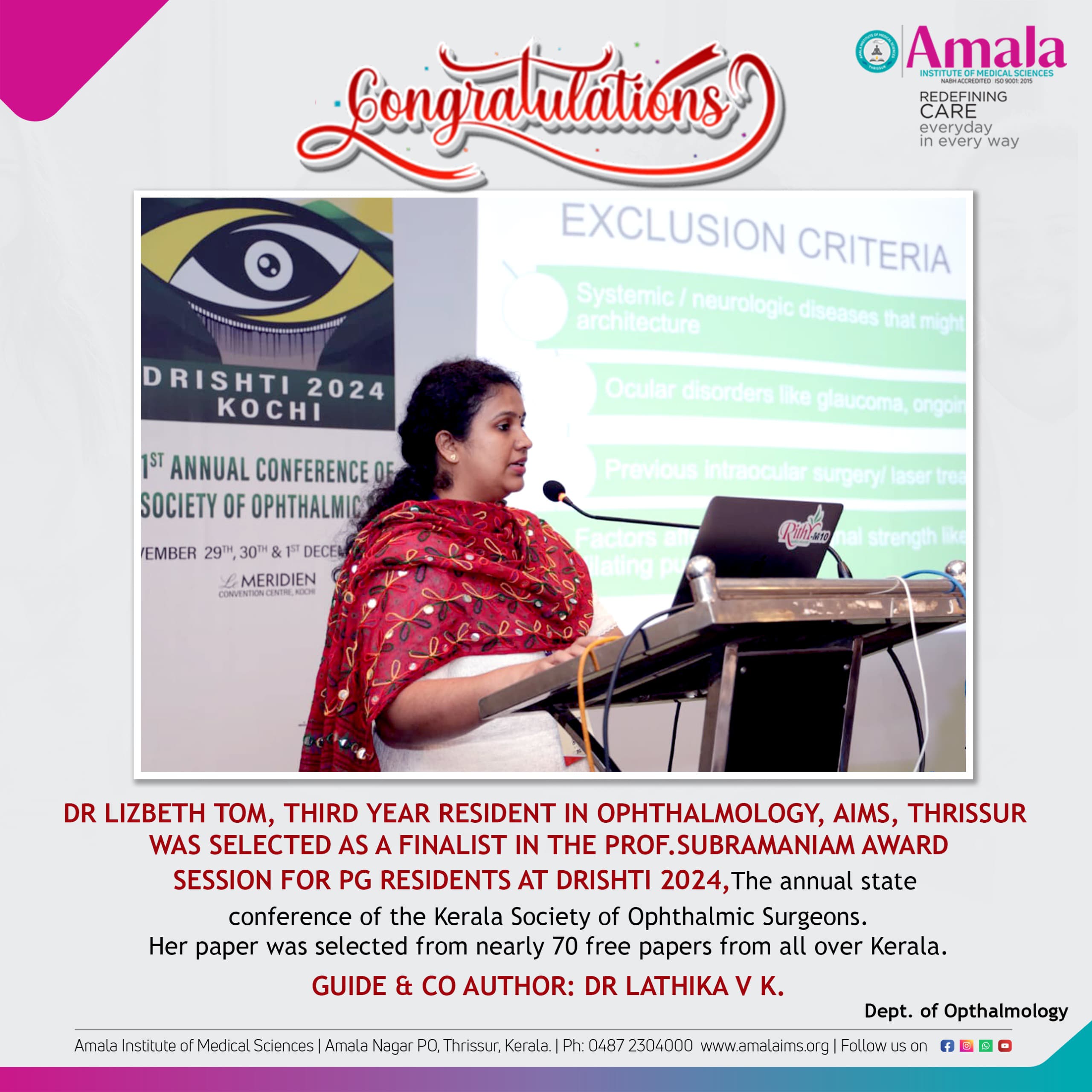 Dr.Lizbeth Tom,Third Year Resident in Ophthalmology.AIMS,Thrissur was selected as a finalist in the Prof.Subramaniam Award seesion for PG Residents @ DRISHTI 2024