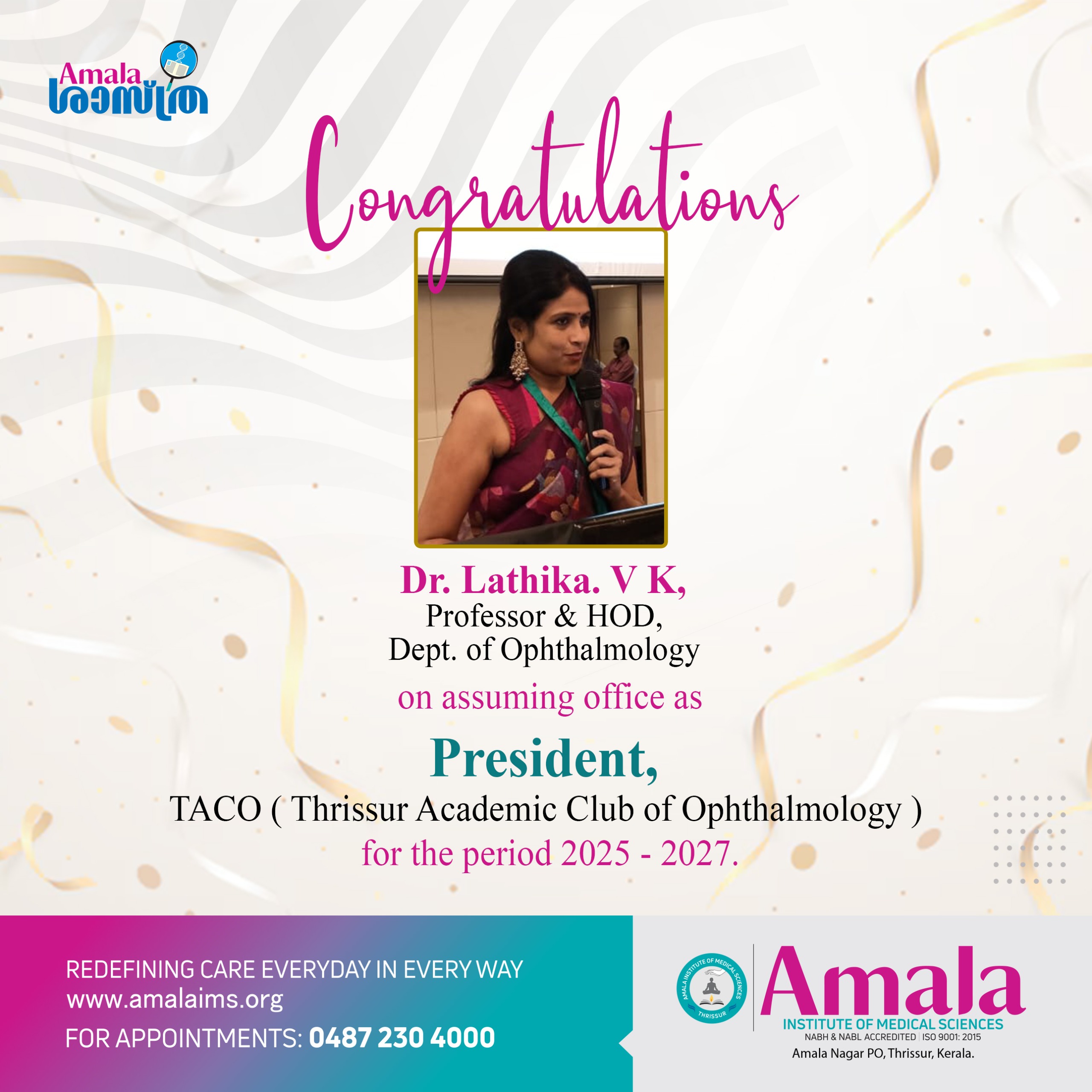 Dr.Lathika V K on assuming office as President, Thrissur Academic Club of Ophthalmology for the period 2025-2027